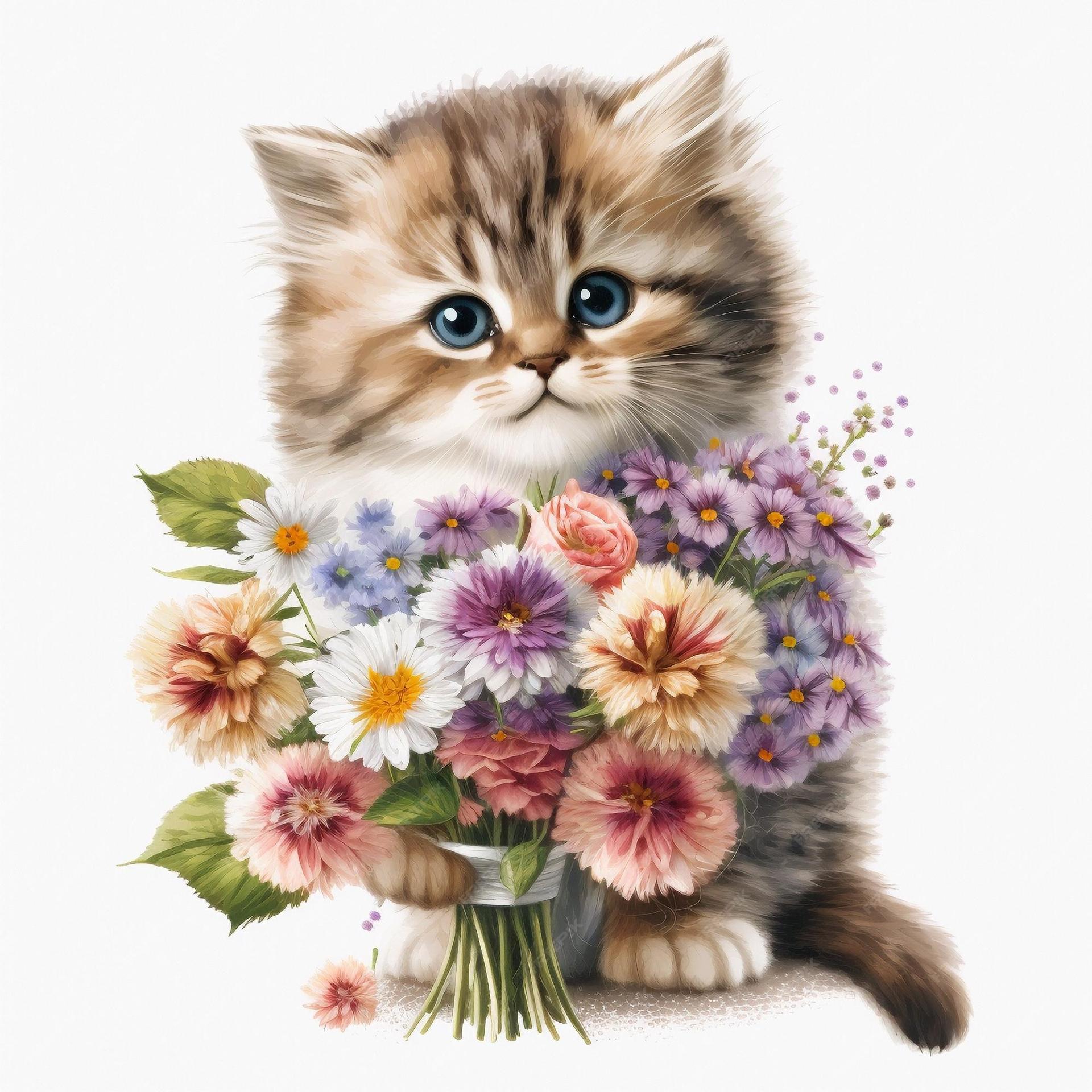 котенок с букетом цветов