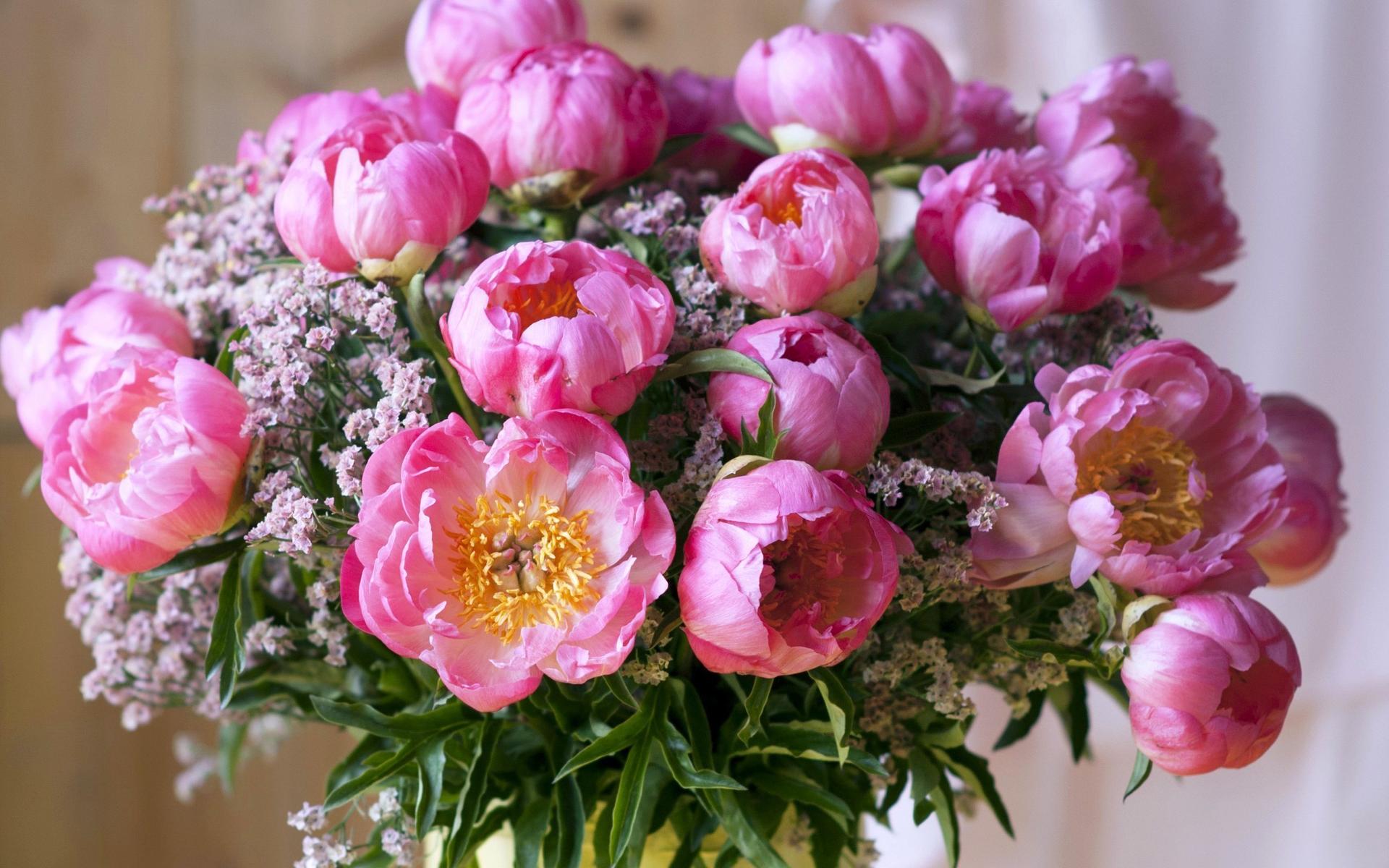 цветы гипсофилы и пионы