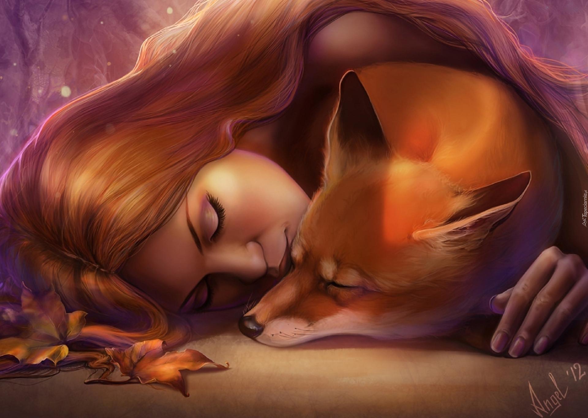 девушка обнимает лису