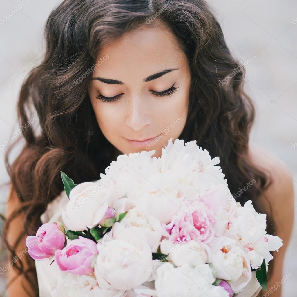 брюнетка с букетом цветов