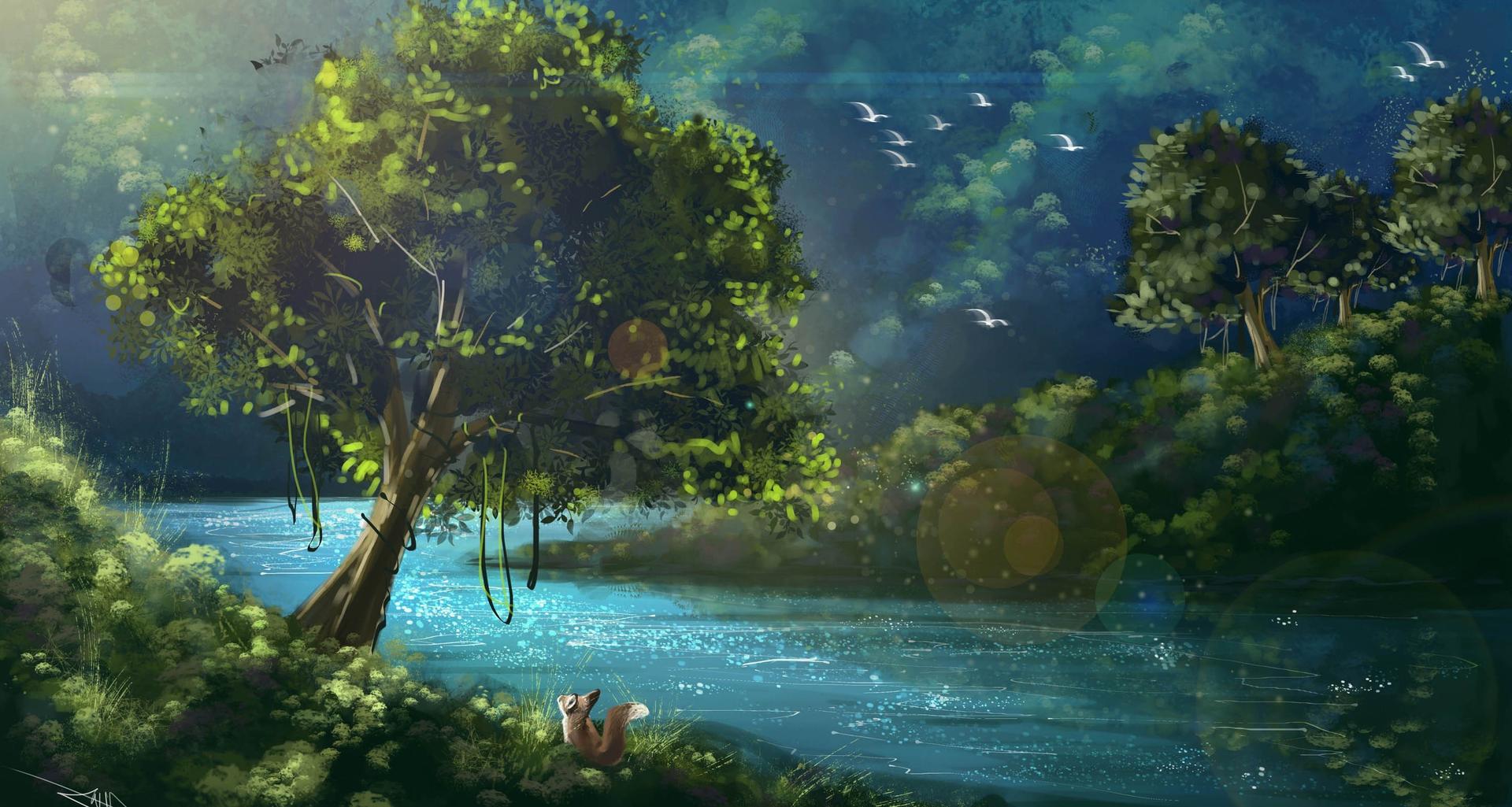 хаяо миядзаки лес ручей вода озеро река