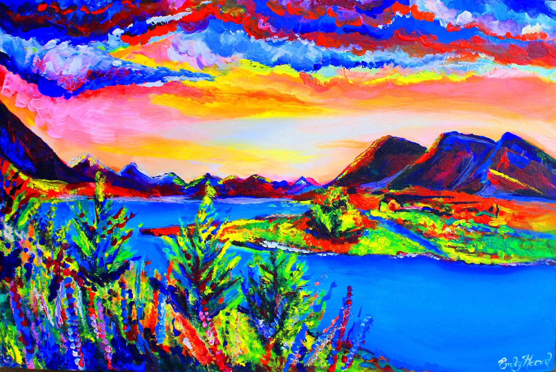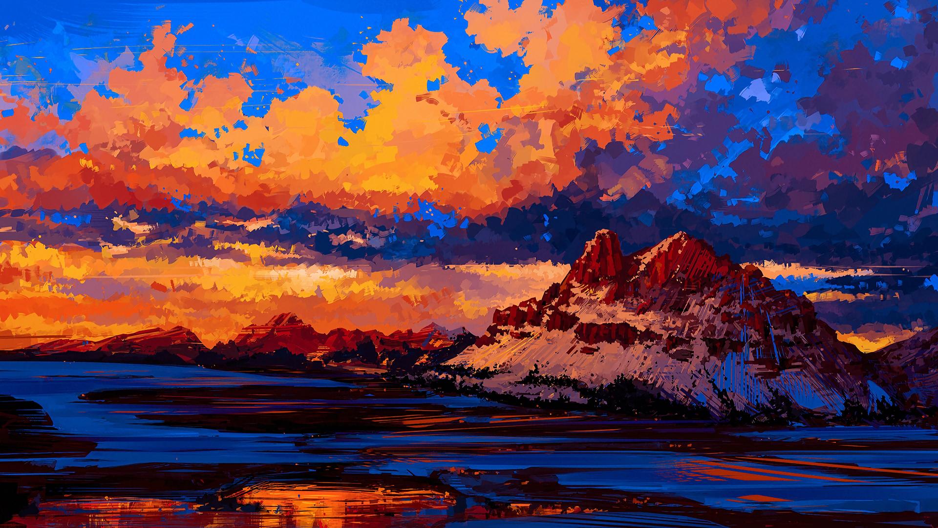 закат в горах красками