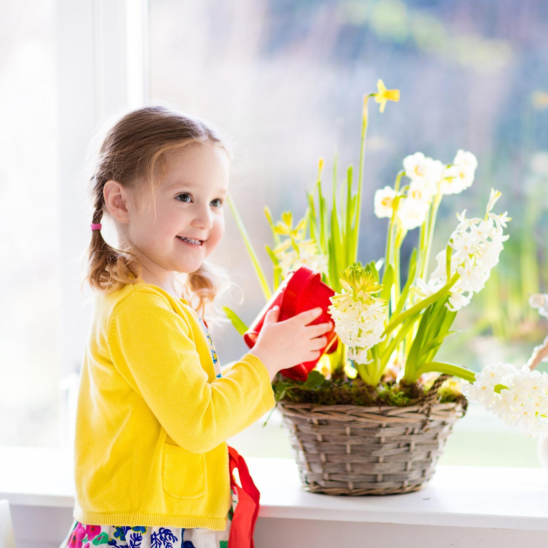 девочкаполивающая тюльпаны