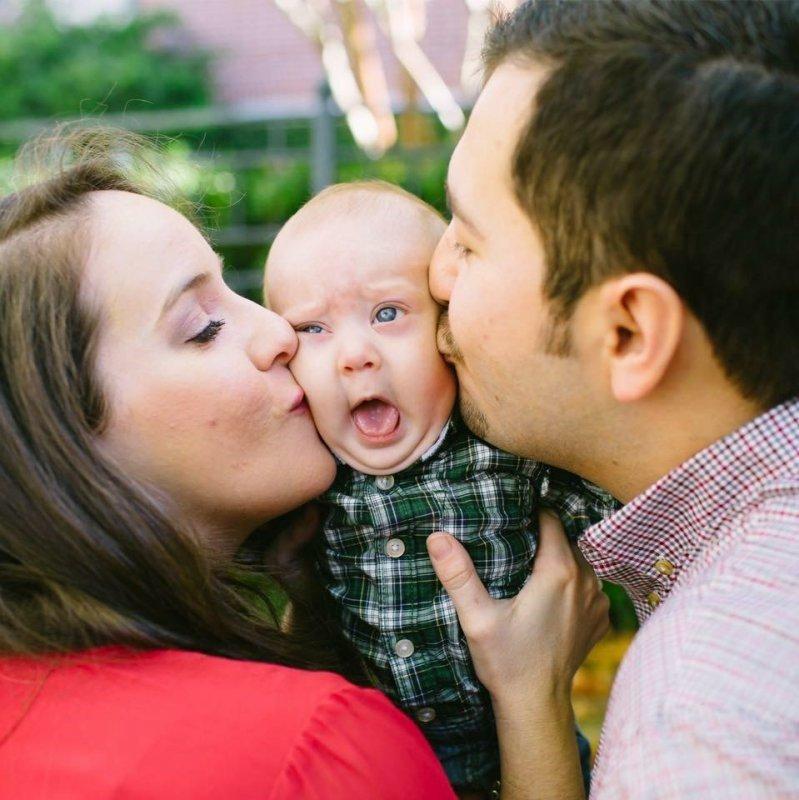 мама и папа целуют малыша