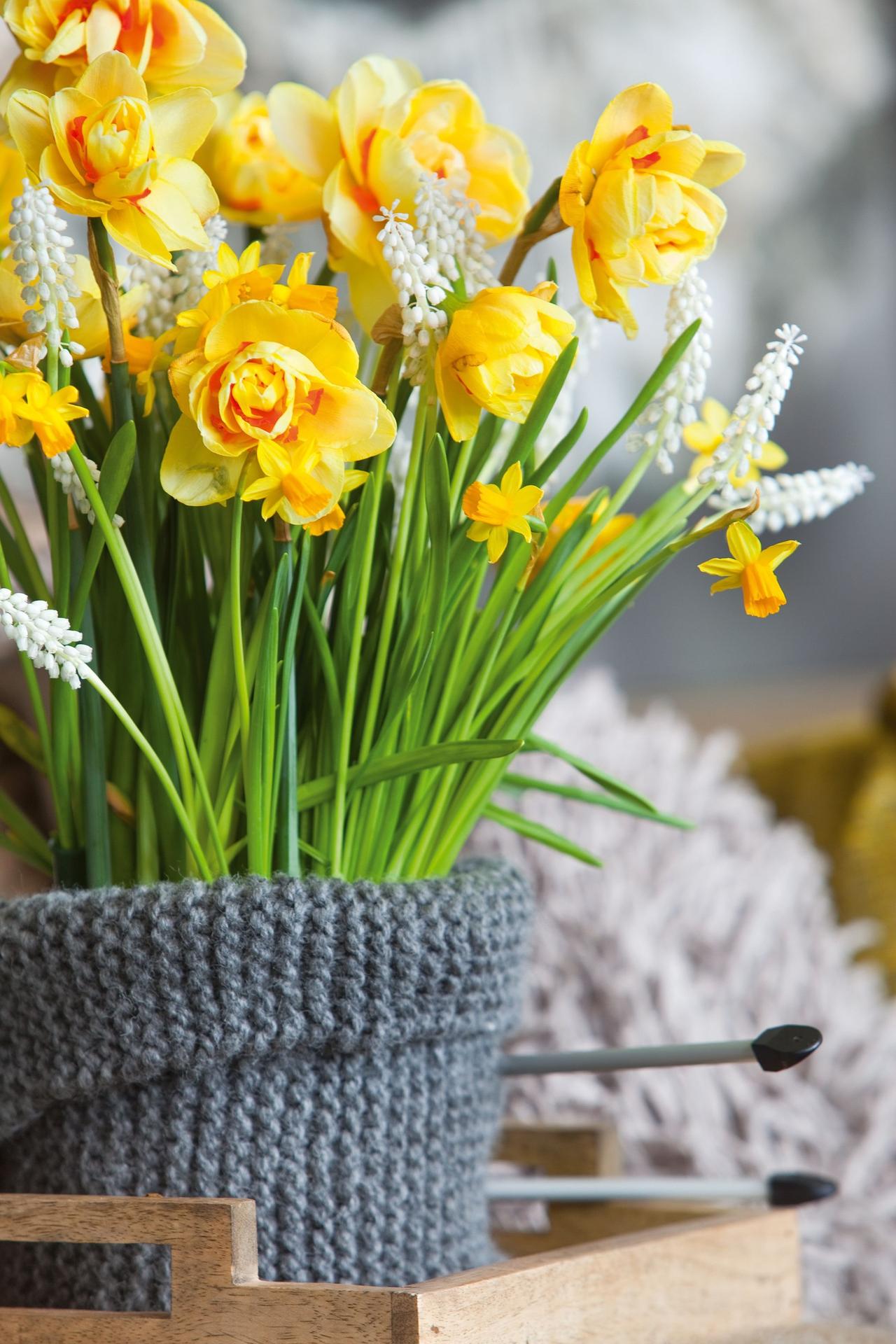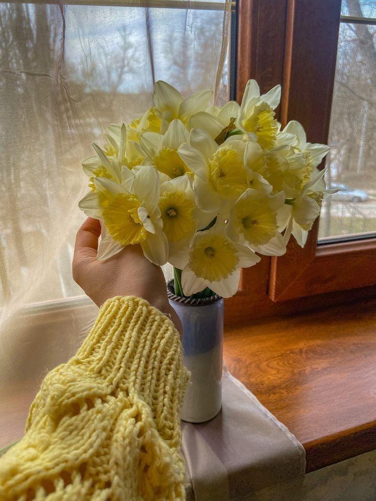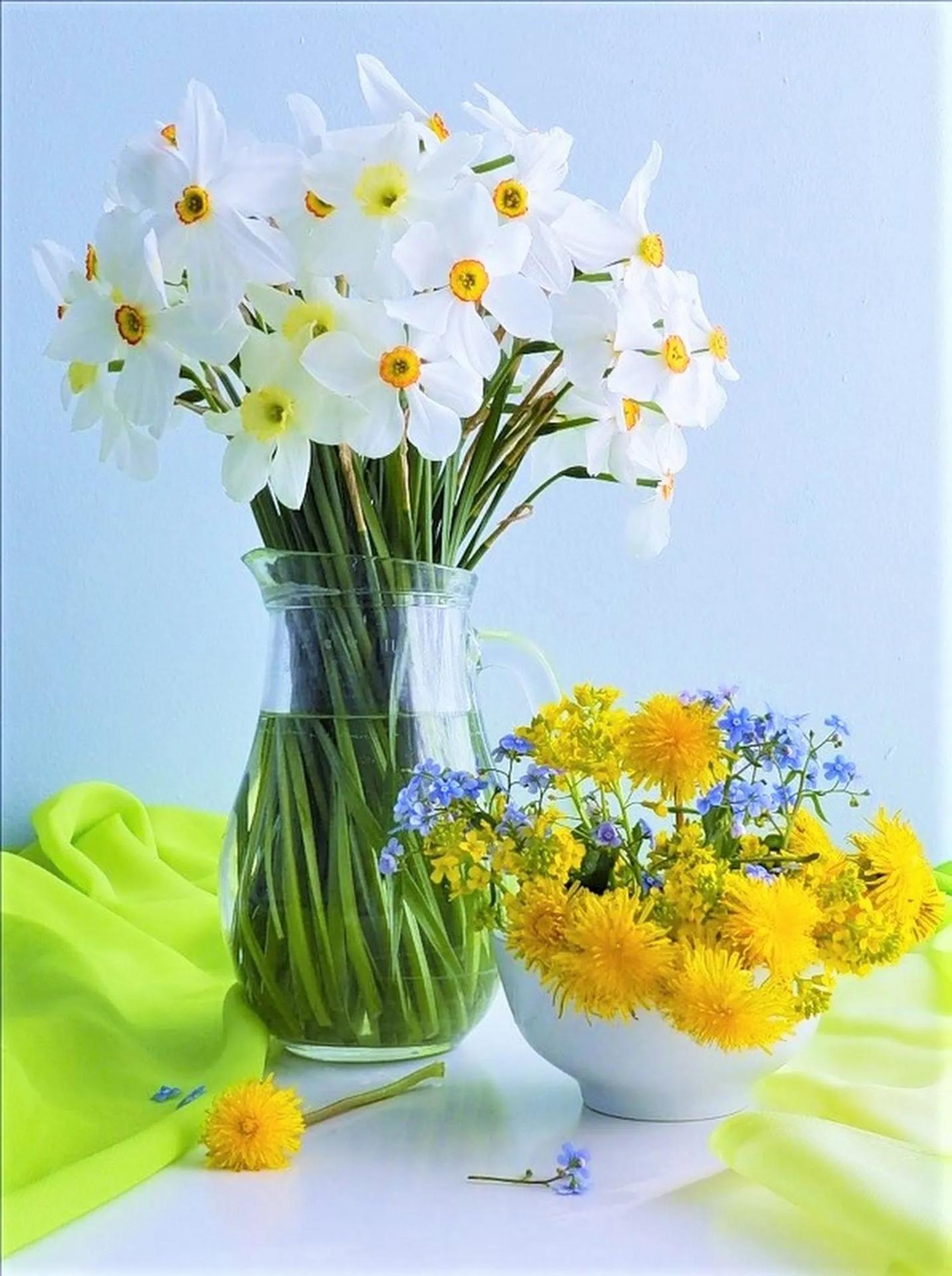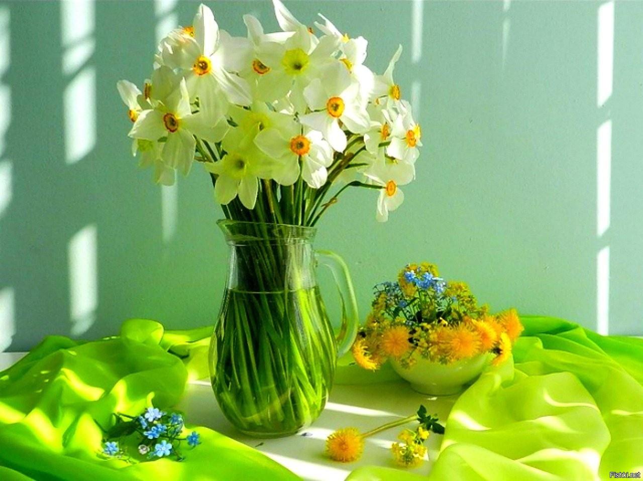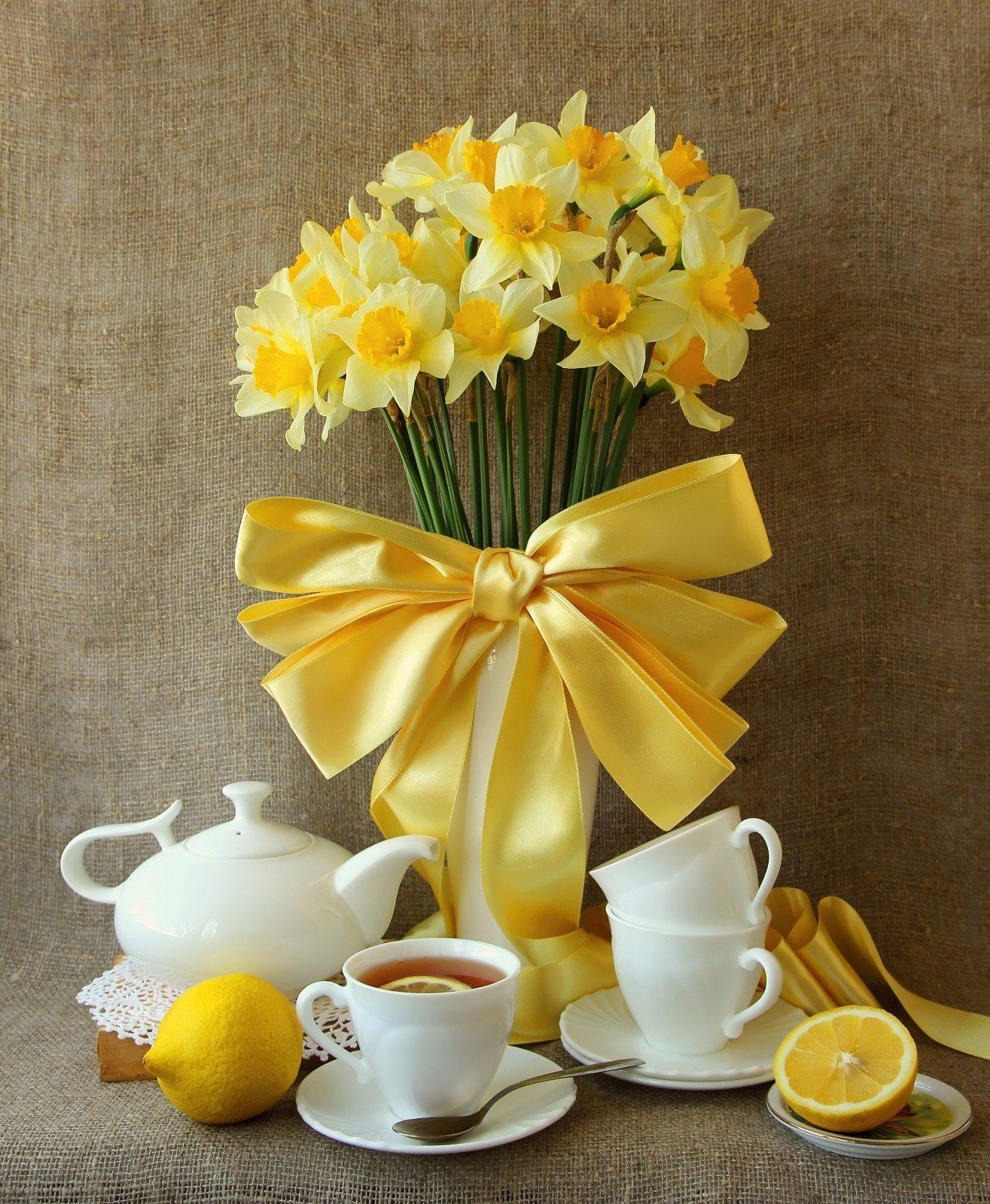 весенние букеты с нарциссами и чай