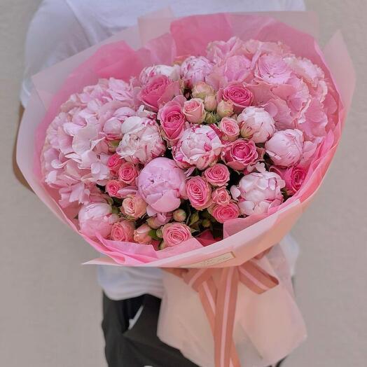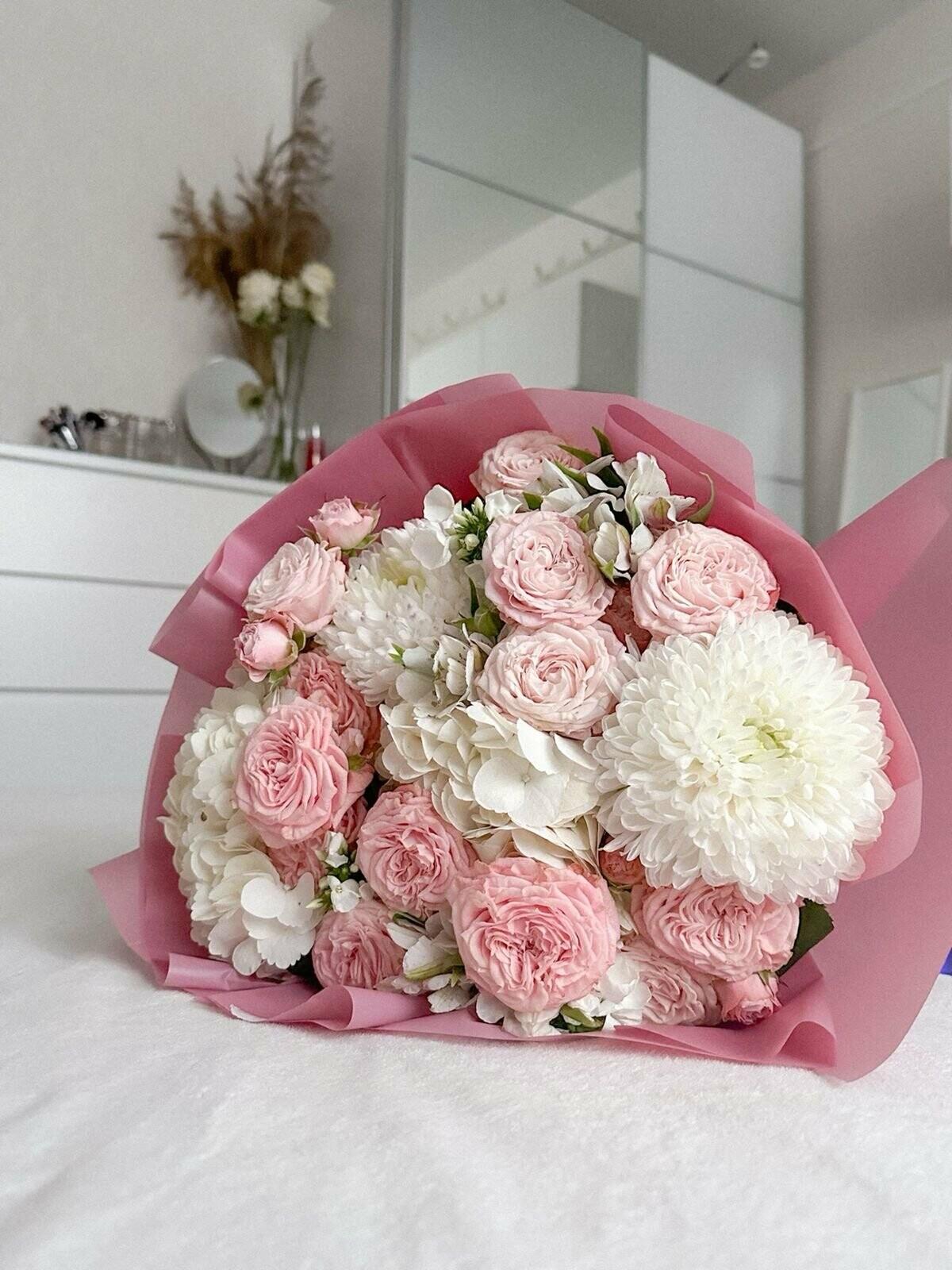 букеты с гортензией и кустовыми розами