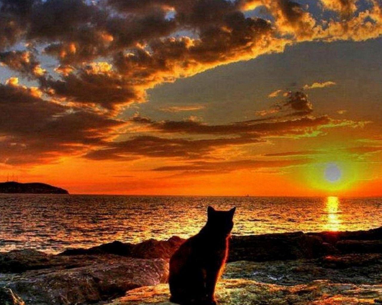 кот любуется закатом