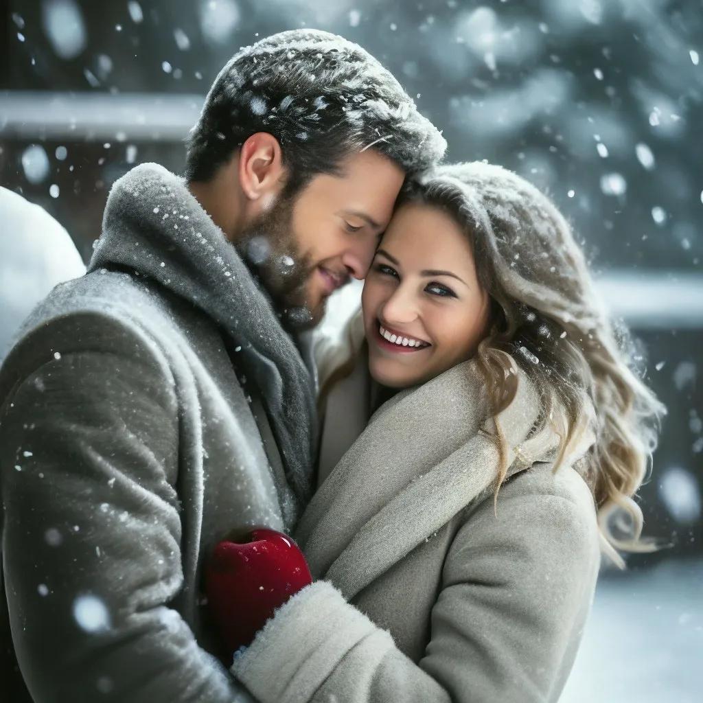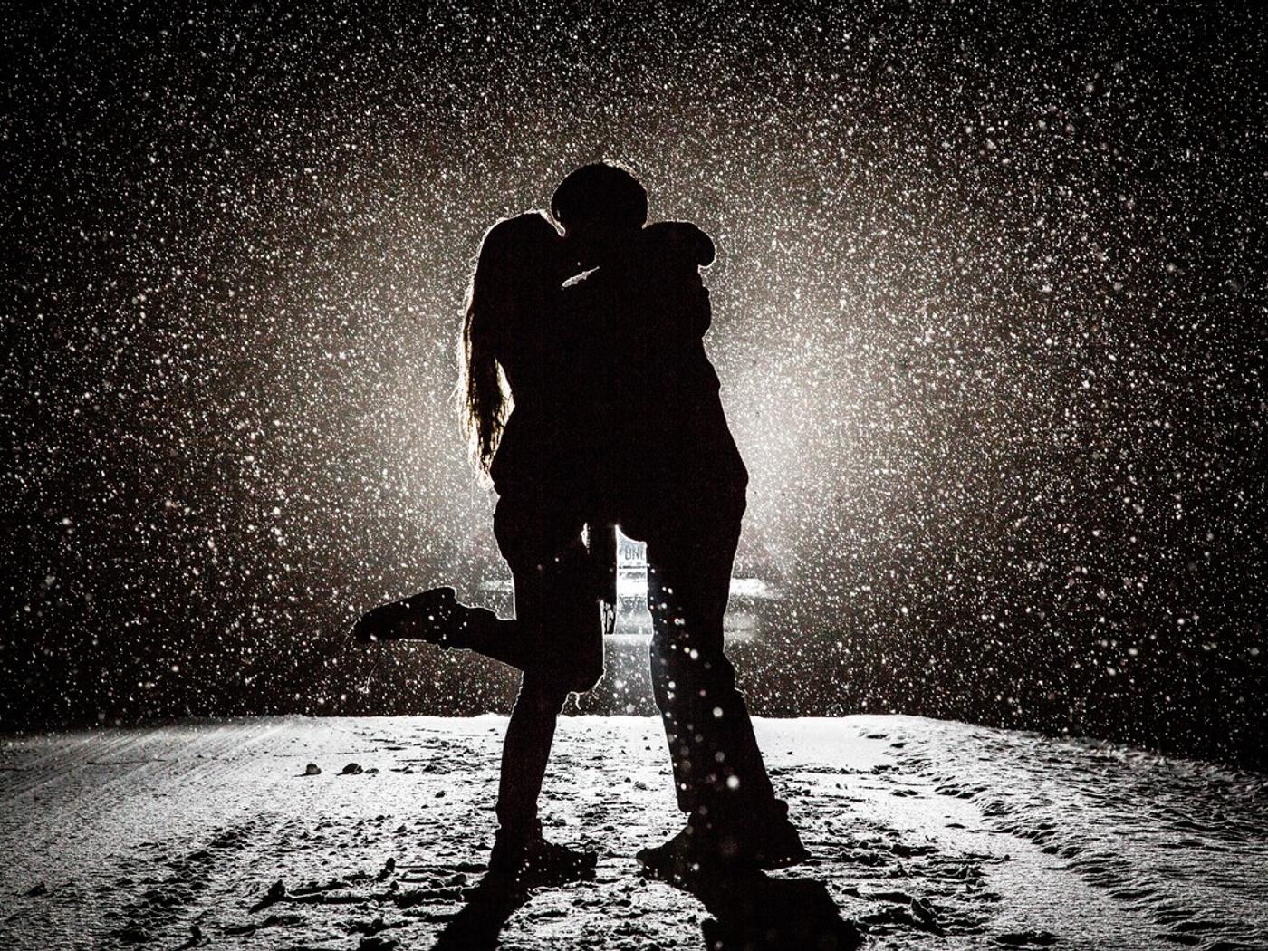 парень и девушка целуются под снегопадом